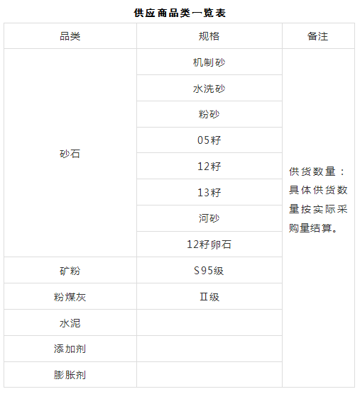 本次征集活動(dòng)為2025年度第一次原材料供應(yīng)商的征集,征集供應(yīng)商品類為:砂石、水泥、粉煤灰、礦粉、膨脹劑、減水劑、外加劑等,現(xiàn)每年總需求約200萬(wàn)噸。